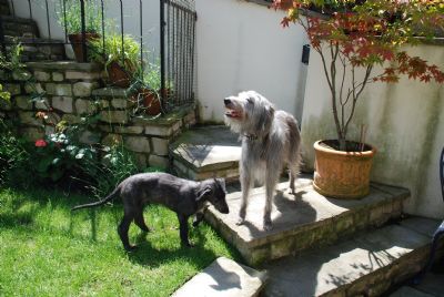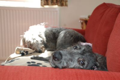 Herbert in his new home with Mathew and Caroline, in bath, with Wilfred the most amazing Lurcher he accepted Herbert from the first moment, allowing him to take treats out of his mouth!